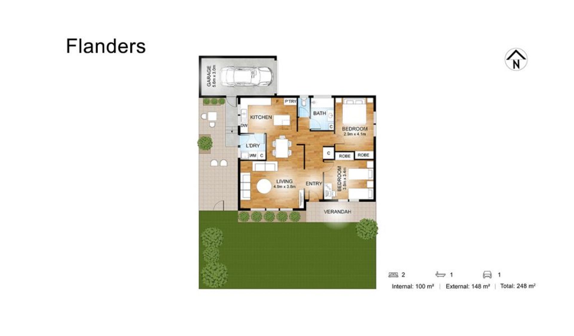 Flanders features an expansive sun-filled open living and dining room that spills into a modern kitchen with Blanco appliances and stone benchtops, including the island bench, offering a great place to entertain.