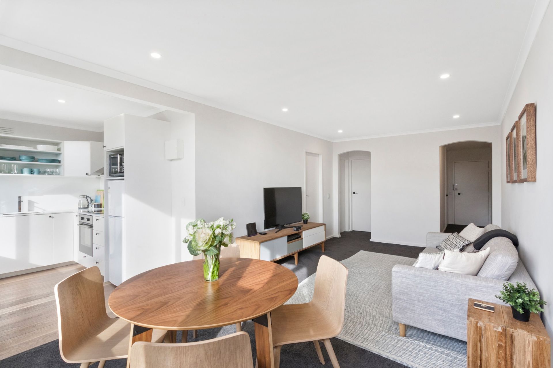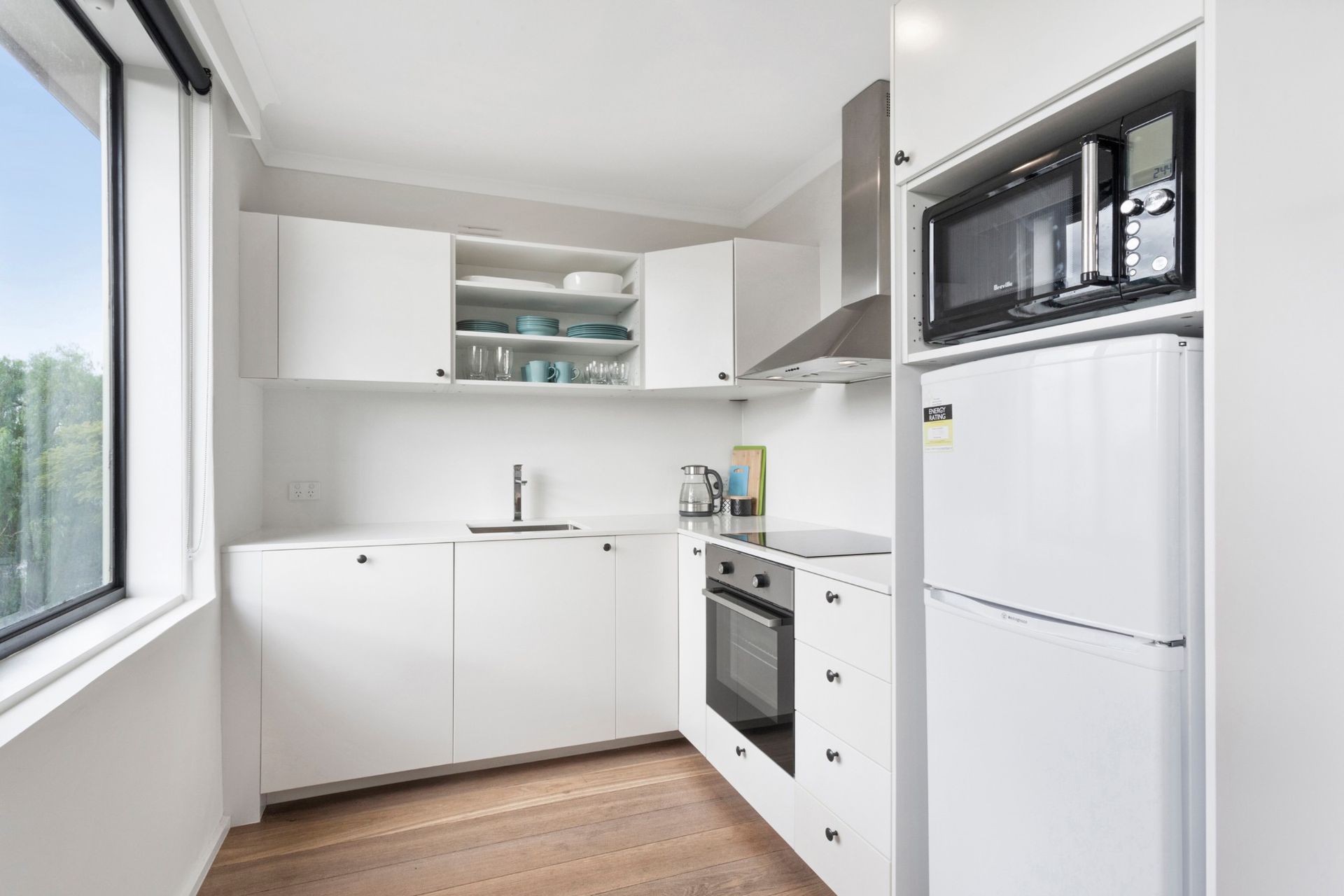 The open-plan white kitchen has ample cupboards, display shelves and drawers. Cooks will appreciate the stainless steel extractor over the oven/hob, microwave and fridge-freezer. Large windows and light wood flooring make this a bright and modern space.