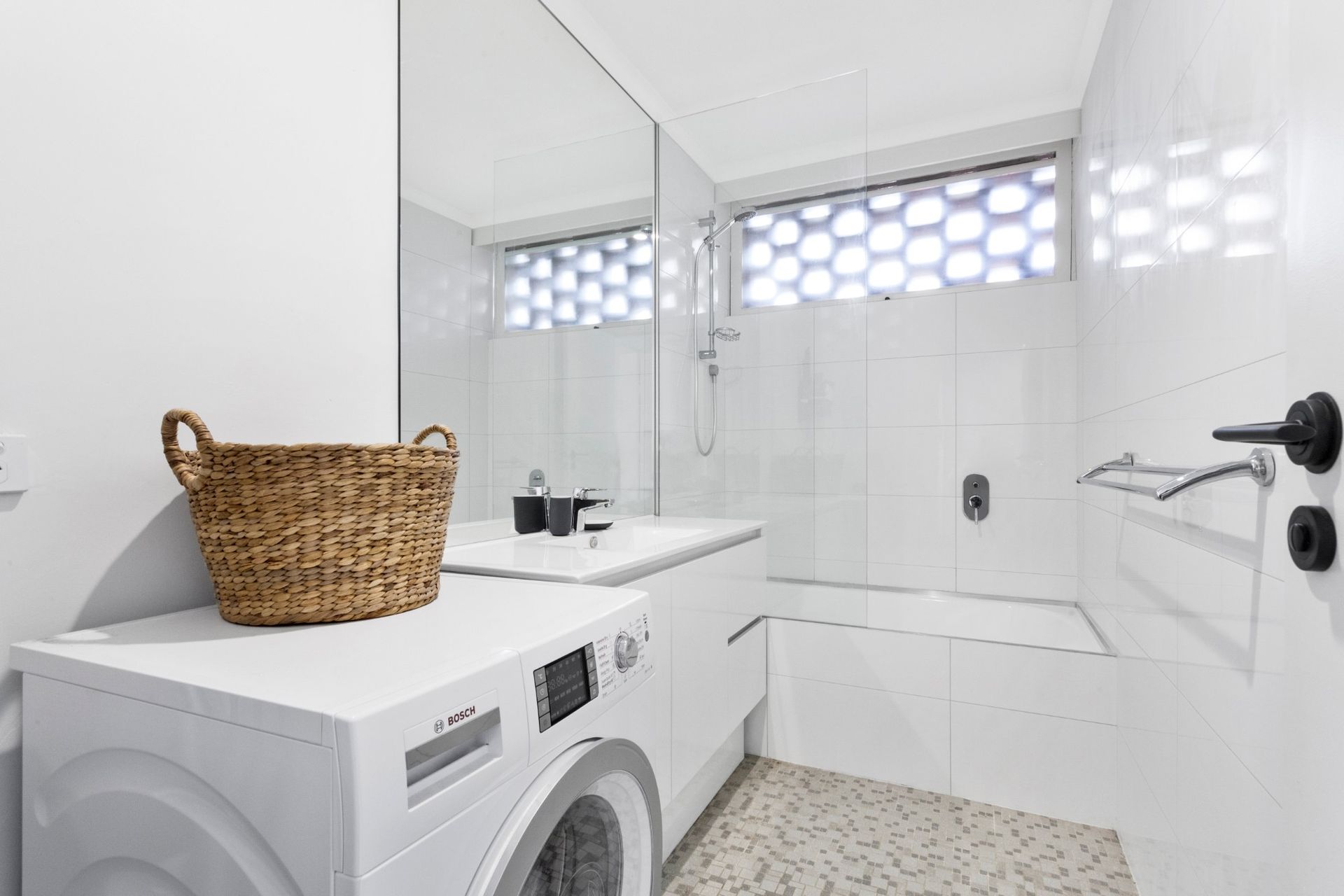 The family bathroom is modern and spacious with laundry facilities, vanity sink with mirror over and a combined shower and bath. There is a separate toilet.