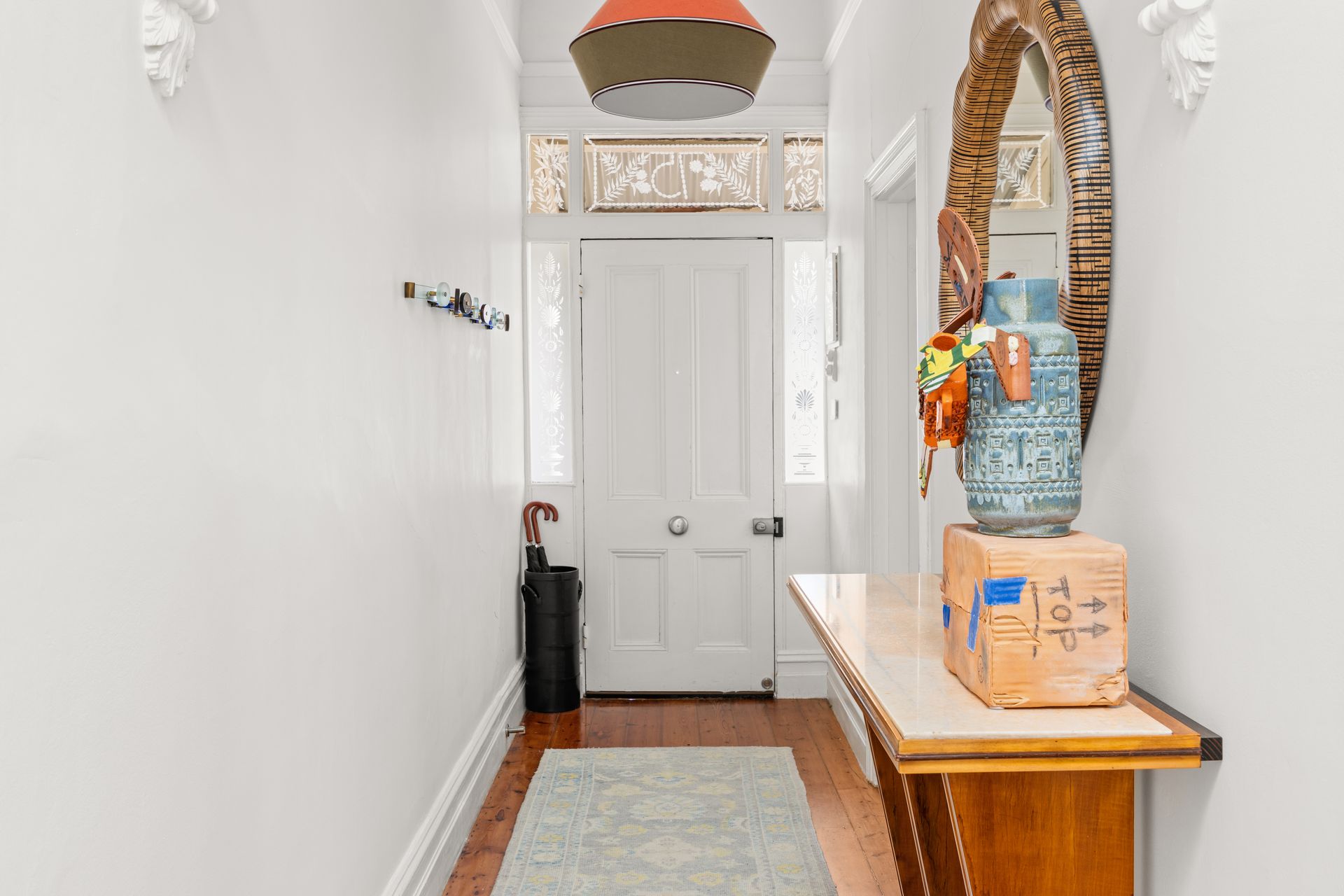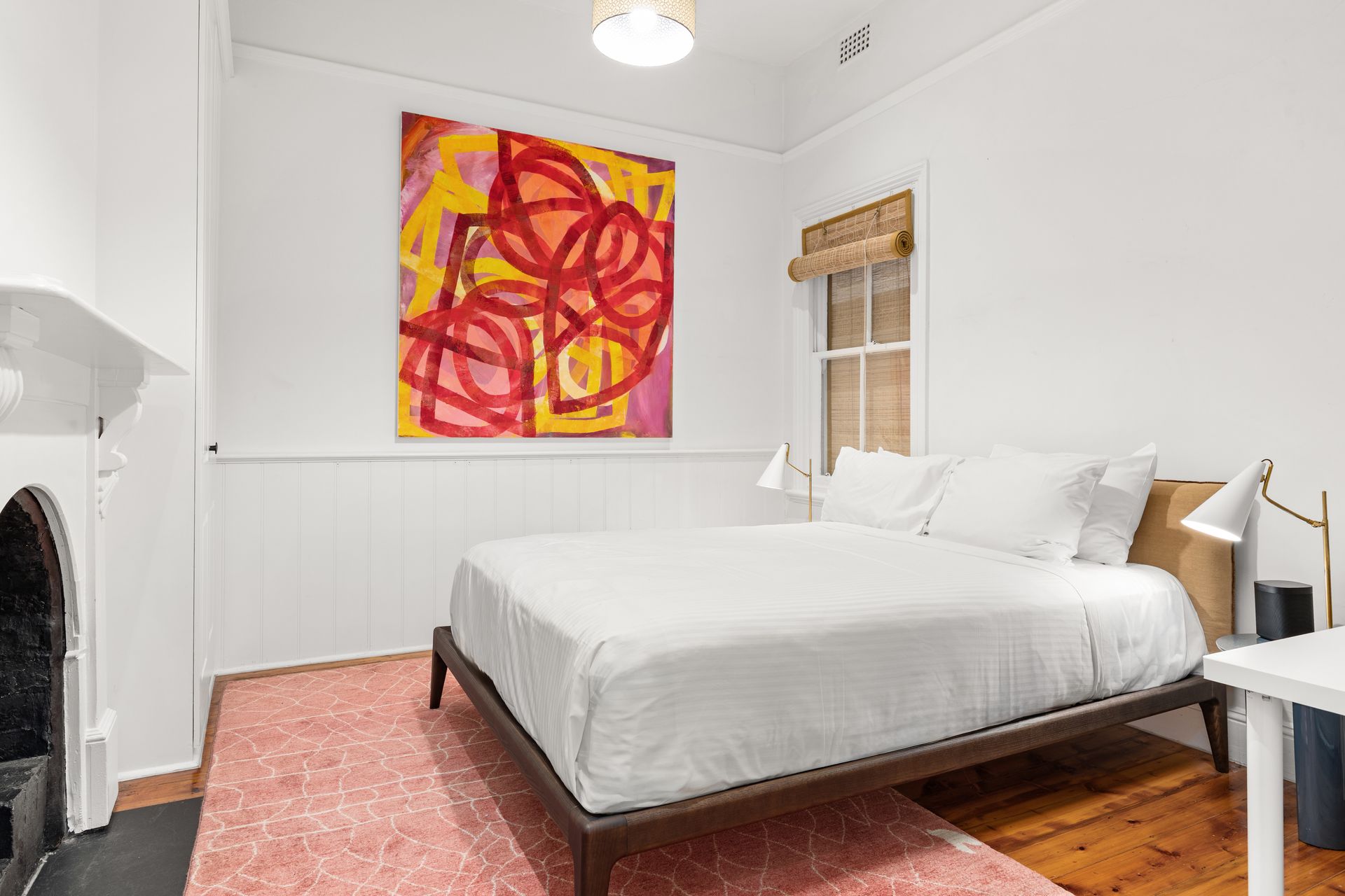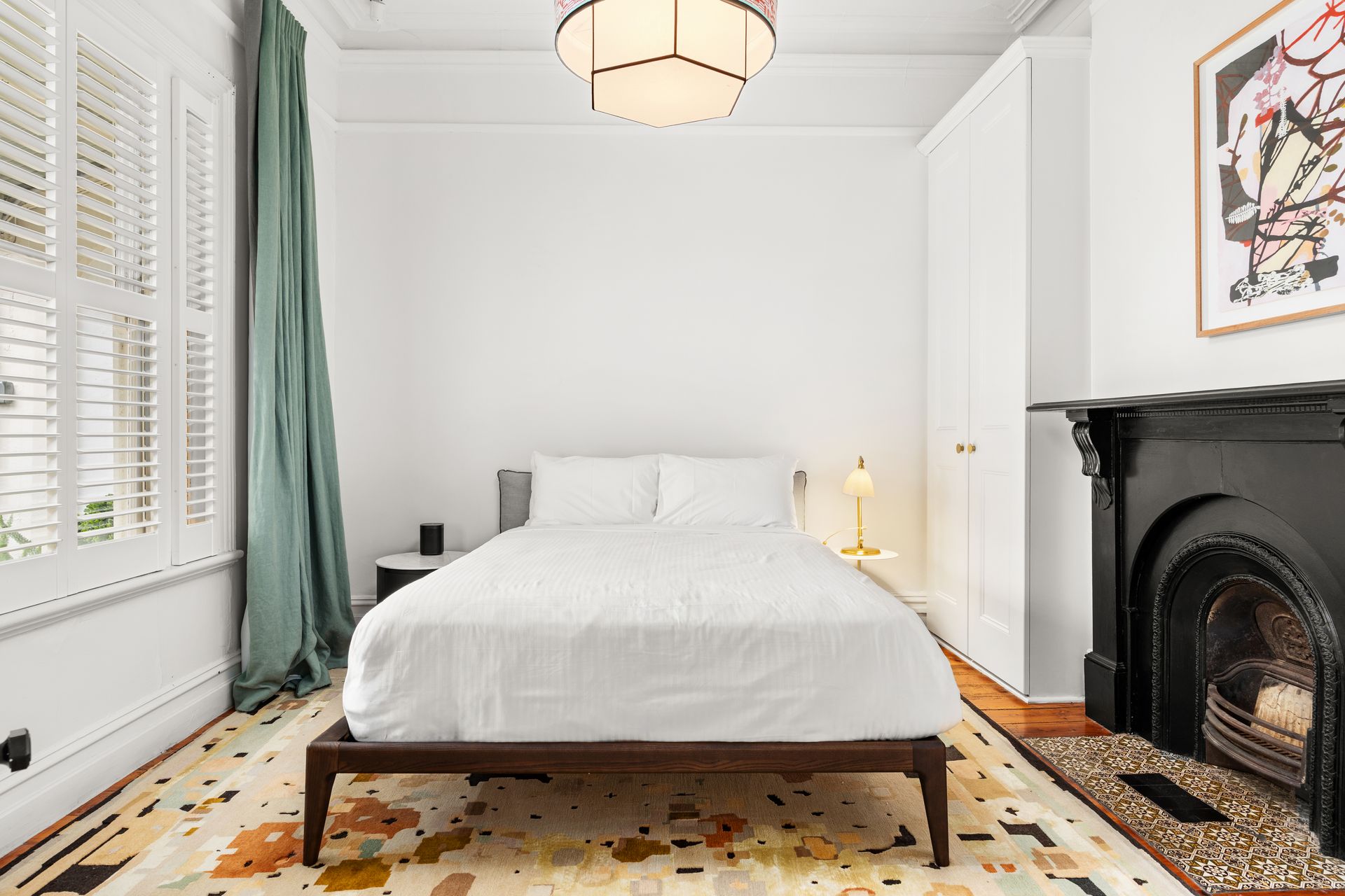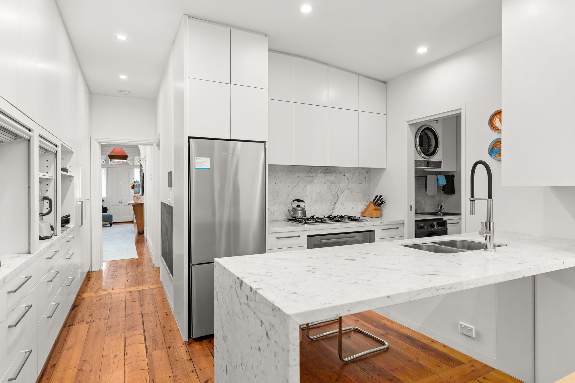 Inside, the home features a long, elegant hallway leading to well-proportioned bedrooms, two featuring decorative fireplaces. The rear of the home opens into a spacious, contemporary kitchen with stone benchtops, quality appliances, and ample storage. The open-plan living and dining area is bright and welcoming, flowing seamlessly out to a private, fully landscaped courtyard with a deck—perfect for relaxing or entertaining outdoors.