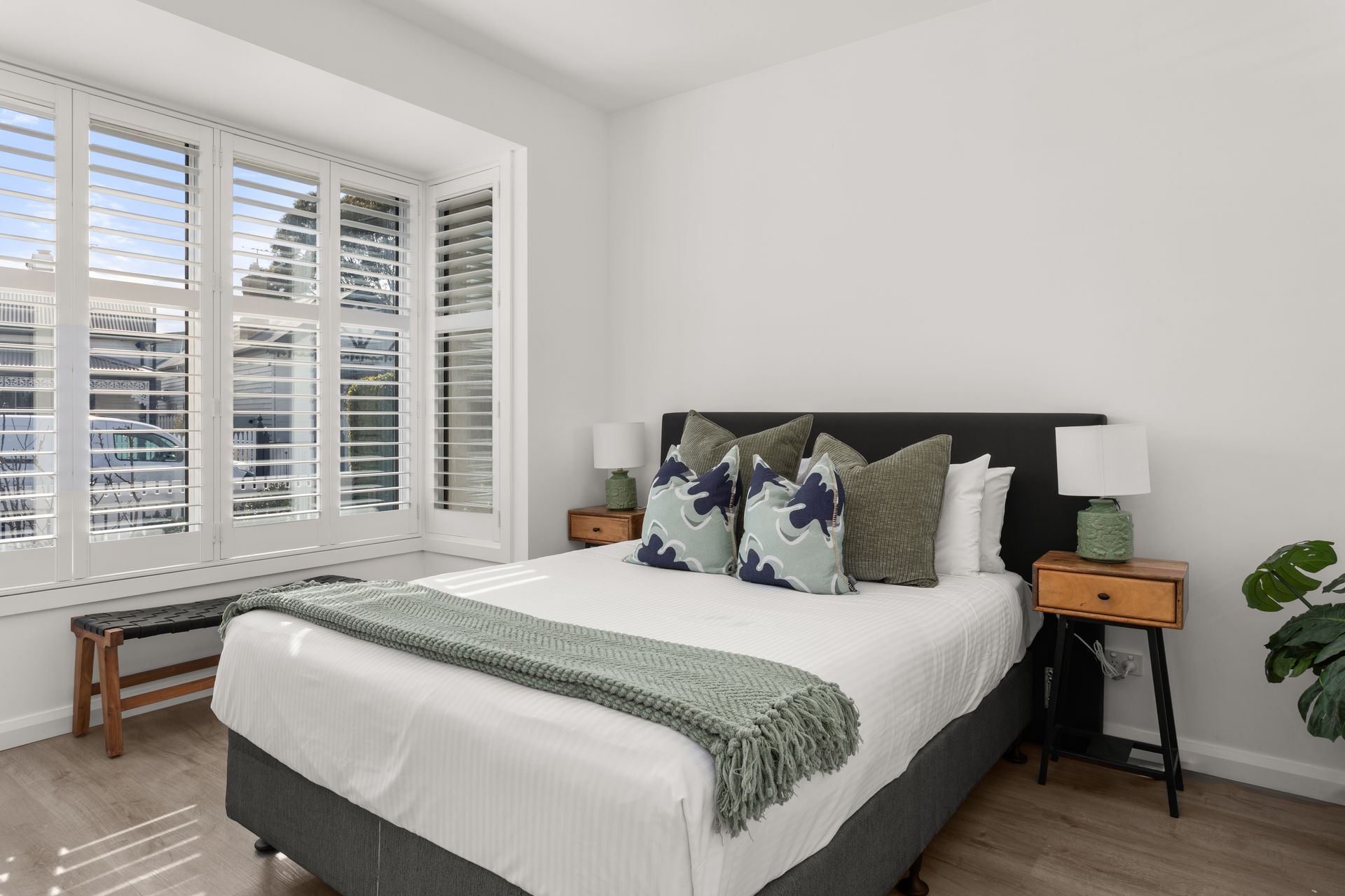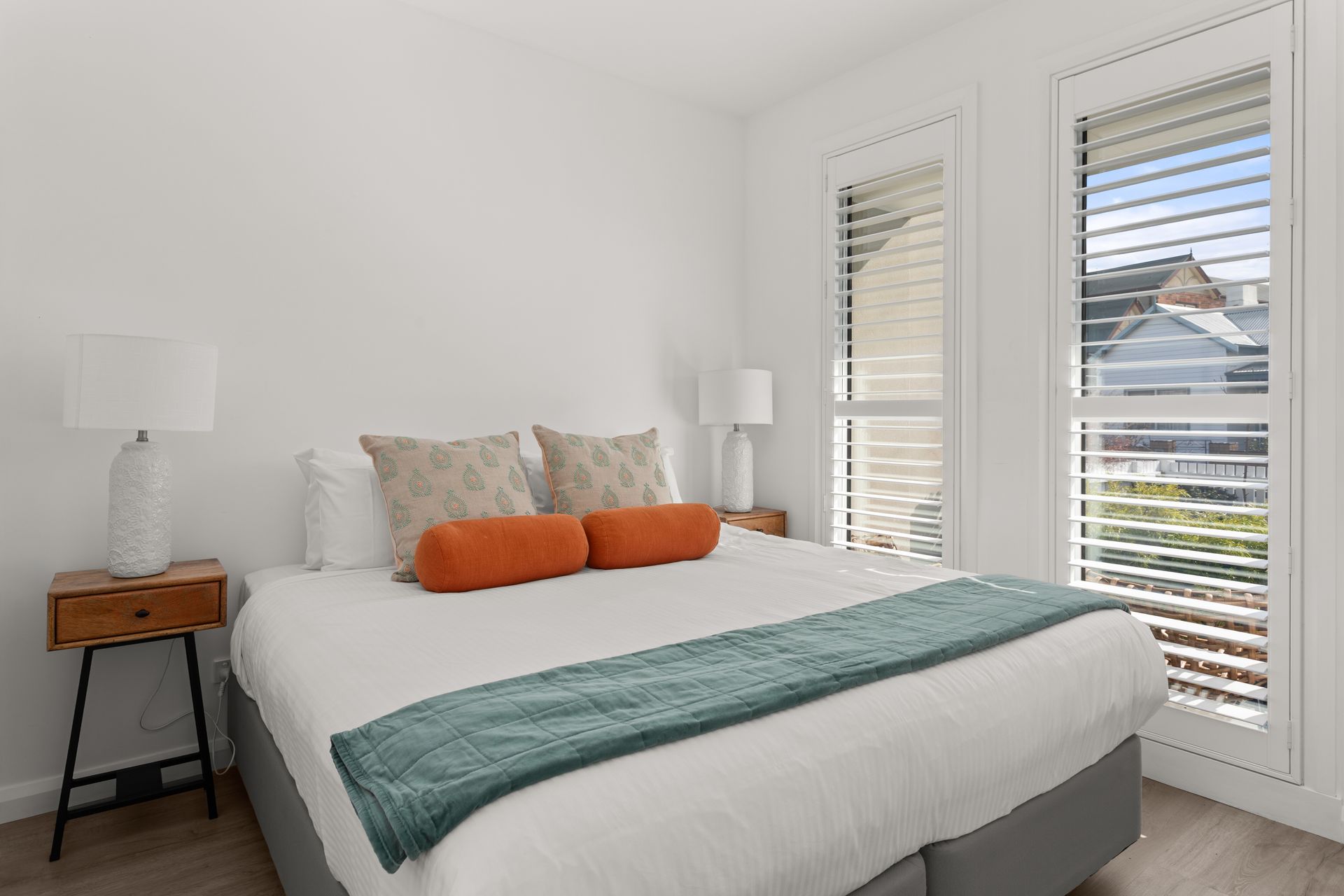 Bedroom 2 (downstairs): Queen-size bed, built-in robes