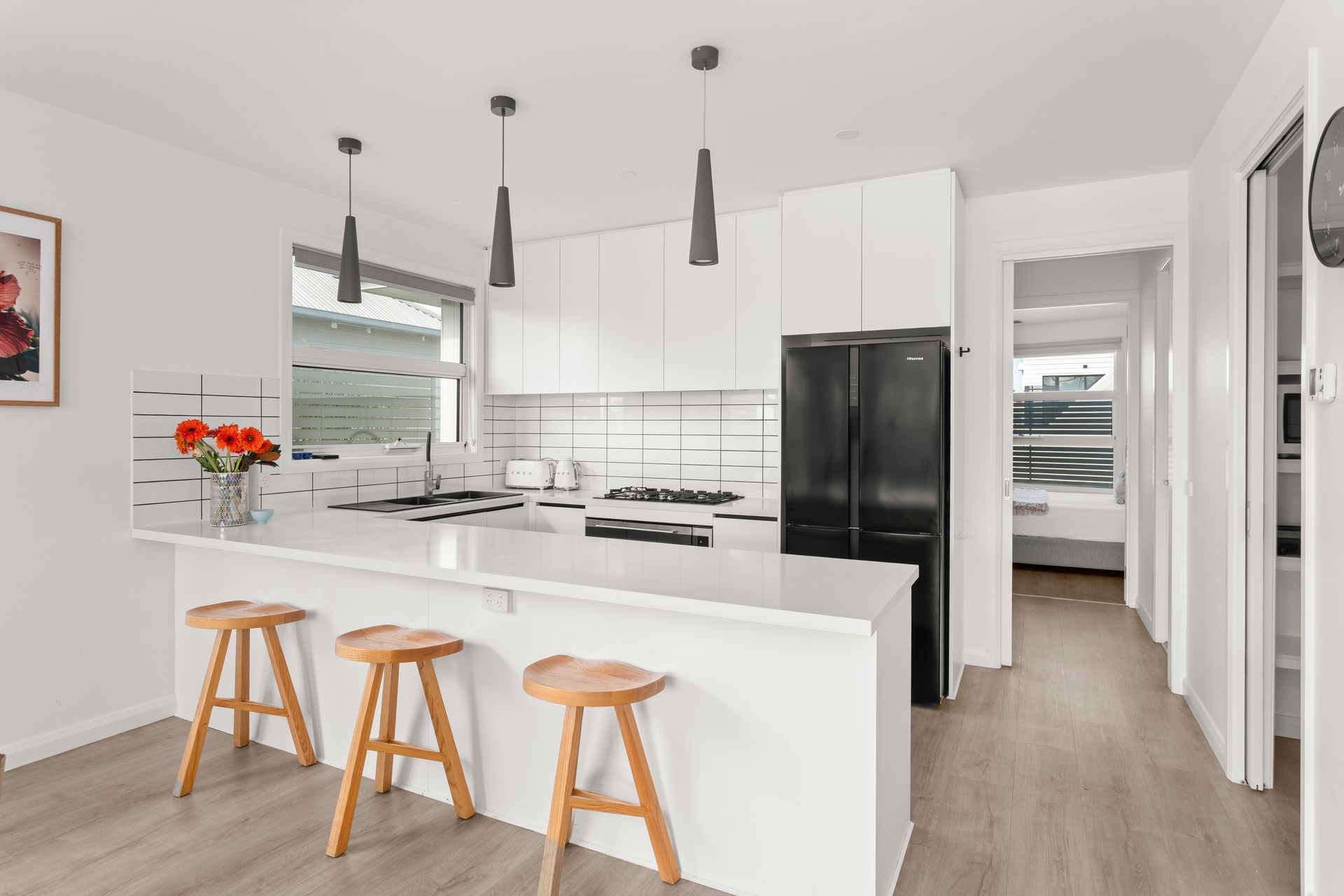 Accommodation is thoughtfully designed with a spacious master bedroom upstairs, featuring a king-size bed, walk-in robe, and modern ensuite. Downstairs, three additional bedrooms provide ample comfort—two with queen beds and a third with flexible bedding that can be set up as two singles or one king. Each bedroom downstairs is fitted with built-in robes and premium bedding. Guests will also find a central bathroom with bath and shower, a separate study ideal for working remotely, a secondary living room, and a laundry with an additional toilet.