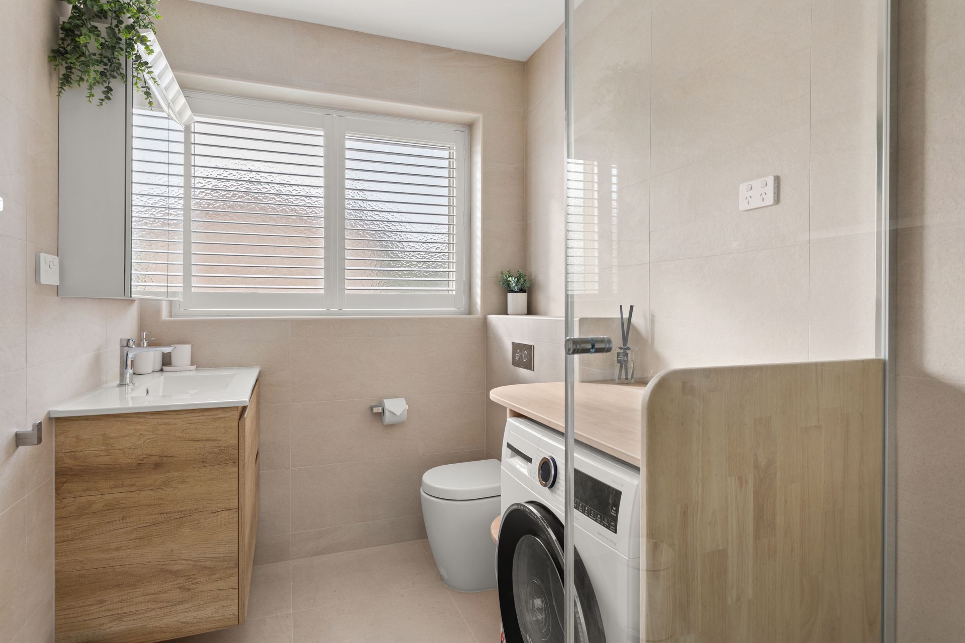 The washing machine/dryer combo is located in the central bathroom.